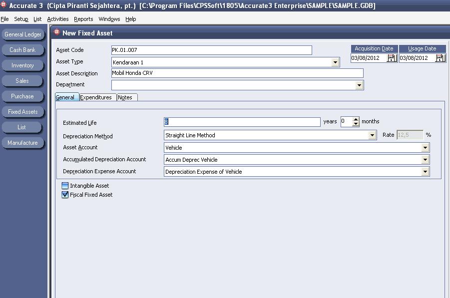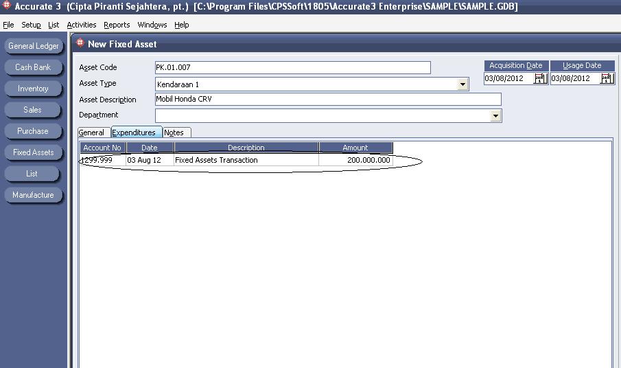 - Setelah pada bagian General selesai, silahkan klik pada Tab Expenditure, dan isikan pada bagian Nomor Akun, dengan akun perantara yang digunakan sebagai penampung nilai pembelian aktiva tetap baru, dan pada bagian Amount isikan nilainya sesuai dengan nilai aktiva tetapnya tsb. Contoh seperti pada gambar dibawah ini.